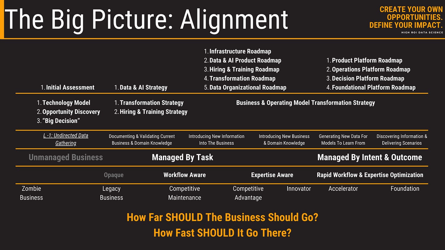 Business leaders must own the decision to invest in data and AI because they own the consequences. I use a framework called “The Big Picture” to showcase the layers involved in strategy implementation and execution. The image below shows one part of the framework.